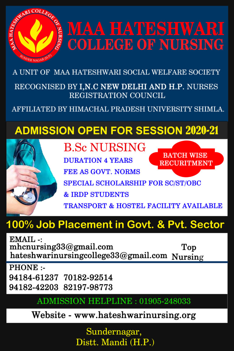 A candidate should have passed 10+2 or its equivalent examination from H.P. Board of School Education/AISSCE/CBSE/ICSE/SSCE/HSCE or any other Board/University established by law in India in the subjects of Physics, Chemistry, Biology and English individually with 45% marks taken together in Physics, Chemistry and Biology at the qualifying examination. The candidates belonging to SC/ST/OBC, the marks obtained in Physics, Chemistry and Biology taken together in qualifying examination will be 40% instead of 45% as stated above. Provided further that English is a compulsory subject in 10+2 for being eligible for admission to B.Sc.(Nursing) course. The candidate should be medically fit.